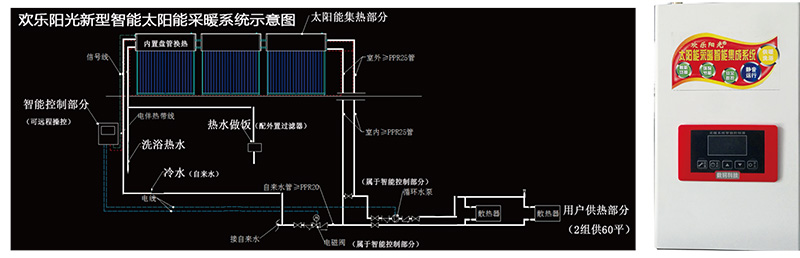 新型智能太陽(yáng)能采暖系統(tǒng)主要由太陽(yáng)能集熱部分、用戶供熱部分及智能控制部分三大部分構(gòu)成。系統(tǒng)通過(guò)獨(dú)立的循環(huán)管路與采暖設(shè)備相連接,供給用戶冬季采暖和全年洗浴和其它用水功能的智能系統(tǒng)。它主要應(yīng)用于單體建筑內(nèi)的小型系統(tǒng),針對(duì)寒冷地區(qū)冬季采暖而研發(fā),響應(yīng)國(guó)家農(nóng)村冬季采暖改革的號(hào)召,實(shí)現(xiàn)用熱與供熱一體化管理,形成用戶自行采暖的格局,是一種無(wú)需增加建筑成本而大幅提高建筑采暖節(jié)能與經(jīng)濟(jì)效益的方案。新型智能太陽(yáng)能系統(tǒng)歷經(jīng)五年研發(fā),十幾種方案反復(fù)篩選,最終選出黃金45度傾角,65厘米加厚保溫層,單管帶水4公斤最佳系統(tǒng),保證早八點(diǎn)到晚五點(diǎn)陽(yáng)光九十度入射角,冬天最高水溫九十三度,最快速把陽(yáng)光熱量收集輸送到室內(nèi)。儲(chǔ)熱水箱450升儲(chǔ)能,純綠色環(huán)保水性發(fā)泡保溫,保證50平米19個(gè)小時(shí)持續(xù)供熱;真空管特點(diǎn):獨(dú)立研發(fā)寶石蘭三金真空管,吸收率98%發(fā)散率≤3%,冬天空曬溫度260度,廣譜吸熱,有光就吸熱,陰天有熱水。